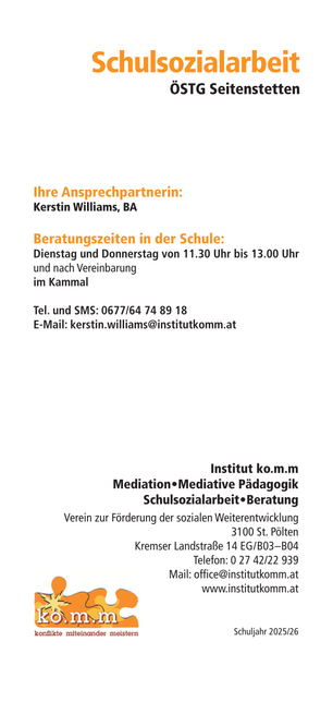 An unserer Schule steht Kerstin Williams als Schulsozialarbeiterin zur Verfügung. Jeden Dienstag und Donnerstag von 11:30-13:00 Uhr kann ihre Unterstützung im “Kammal” im 2. Stock in Anspruch genommen werden.