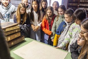 Die 2A und die 2B besuchten mit ihrem Religionslehrer Pater Matthäus das barocke Studierzimmer der Stiftsbibliothek. Dort zeigte ihnen Stiftsarchivar Markus Bürscher einige Exemplare der ältesten Bibelhandschriften des Stiftes sowie die Baupläne des Hauses.