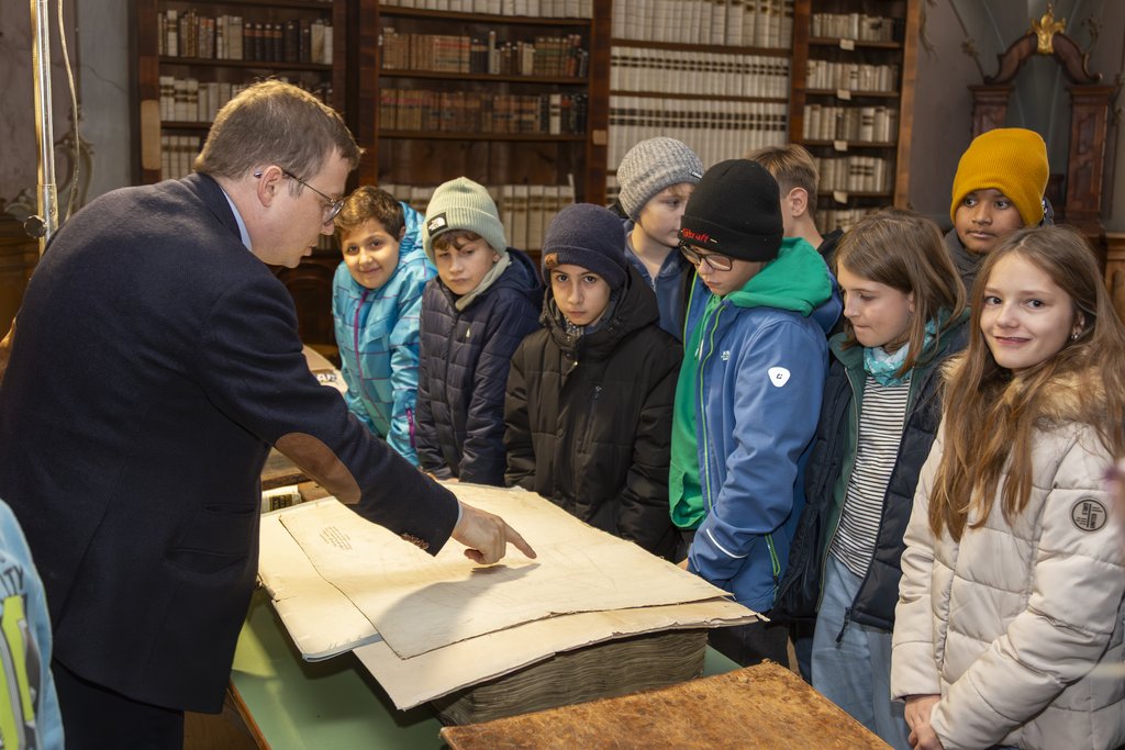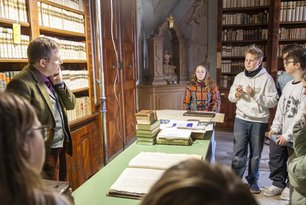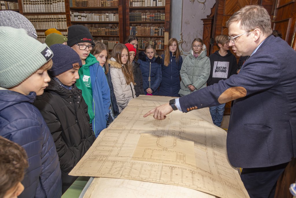 Der Archivar erklärte ihnen die Entwicklung von den Handschriften bis hin zu den frühesten Druckexemplaren des Stiftes. Sie durften auch die ersten Baupläne für einen barocken Neubau des Stiftes sehen, die der Italiener Giovanni Giacomo Enea Zoardi entworfen hatte und auf die der spätere Baumeister Joseph Munggenast „aufgebaut“ hat.