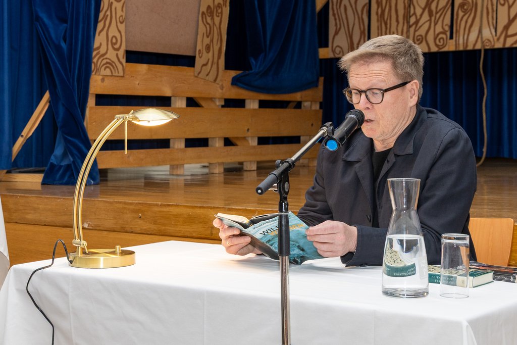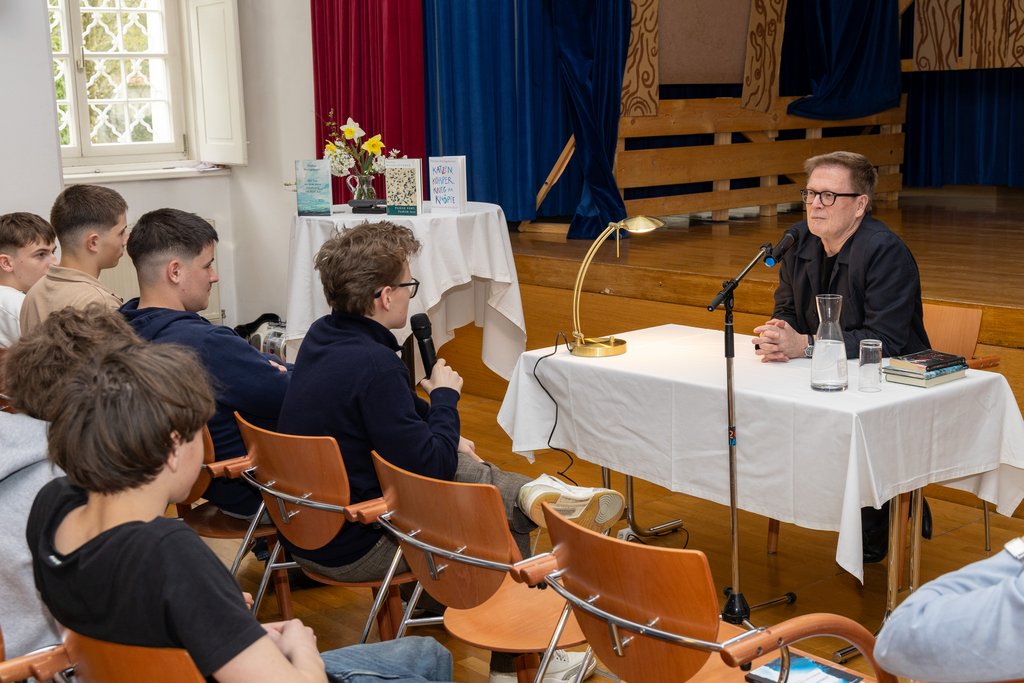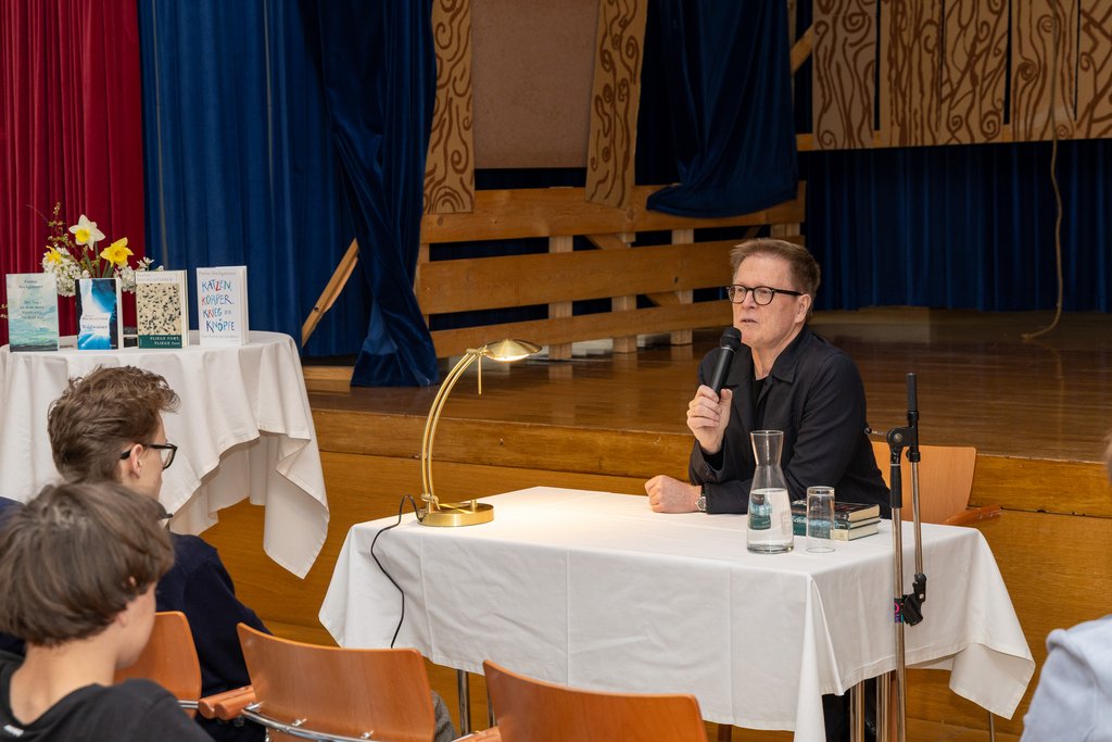 Am 14. April durften wir den Autor und Kinder- und Jugendpsychiater Paulus Hochgatterer in unserem Gymnasium begrüßen. Nach einem Leseimpuls aus seiner Erzählung „Wildwasser“ (1997) entspannte sich zunächst eine Diskussion über das Schreiben. Wie kommt ein Autor zu seinen Themen und Inhalten? Wie plant er oder entwickelt sich eine Geschichte von selber? Paulus Hochgatterer bestätigte die Kritik, dass er beim Schreiben „Perfektionist“ sei.